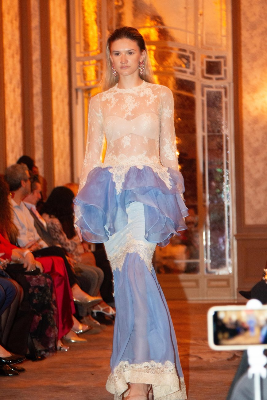 The show opened like a dream. Models glided through the salon as if stepping out of constellations, gowns catching the light in fluid waves of silk chiffon, satin, and taffeta. There was something cinematic in the air — an otherworldly sense that we were witnessing fashion’s return to its truest form: fantasy that can be worn.